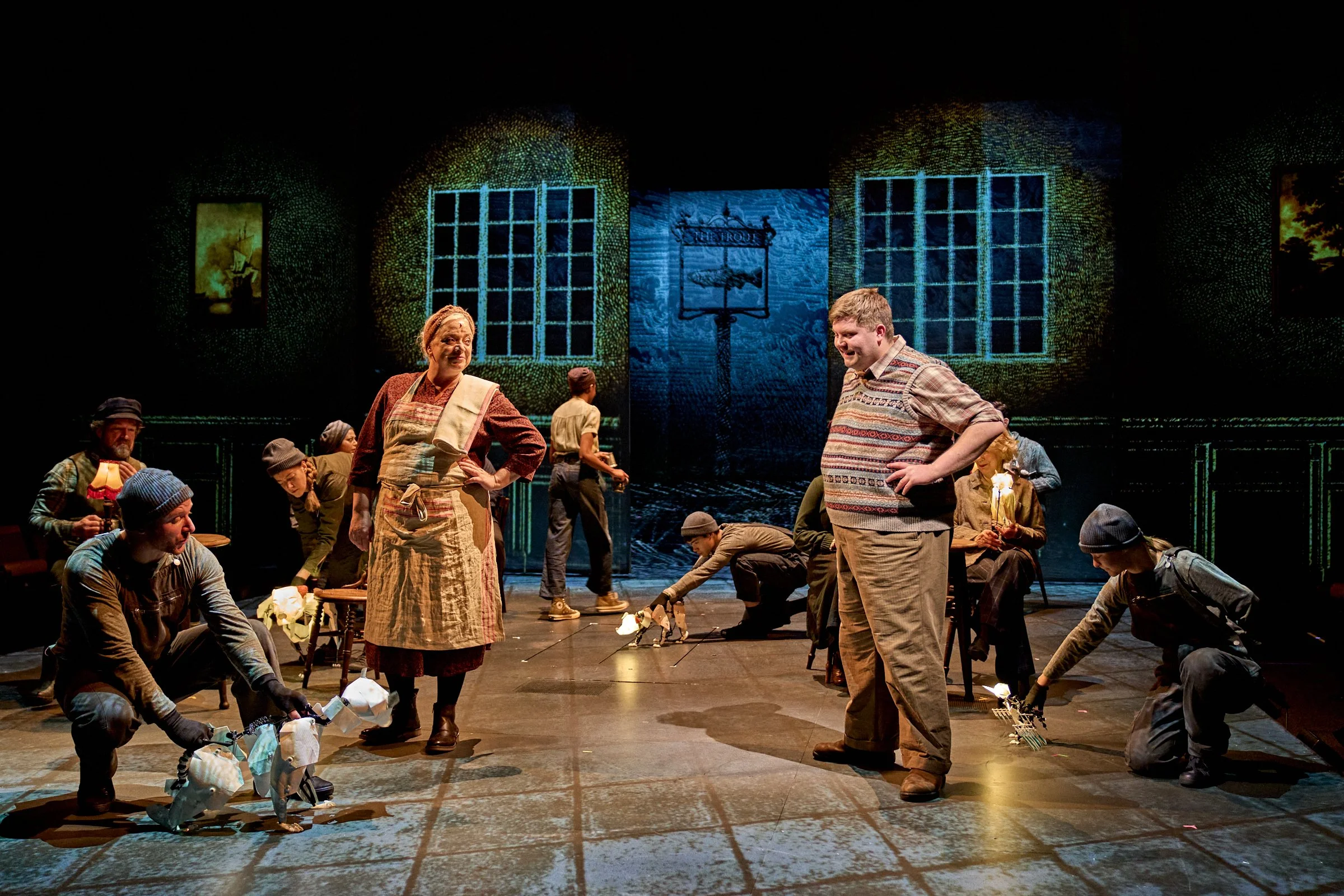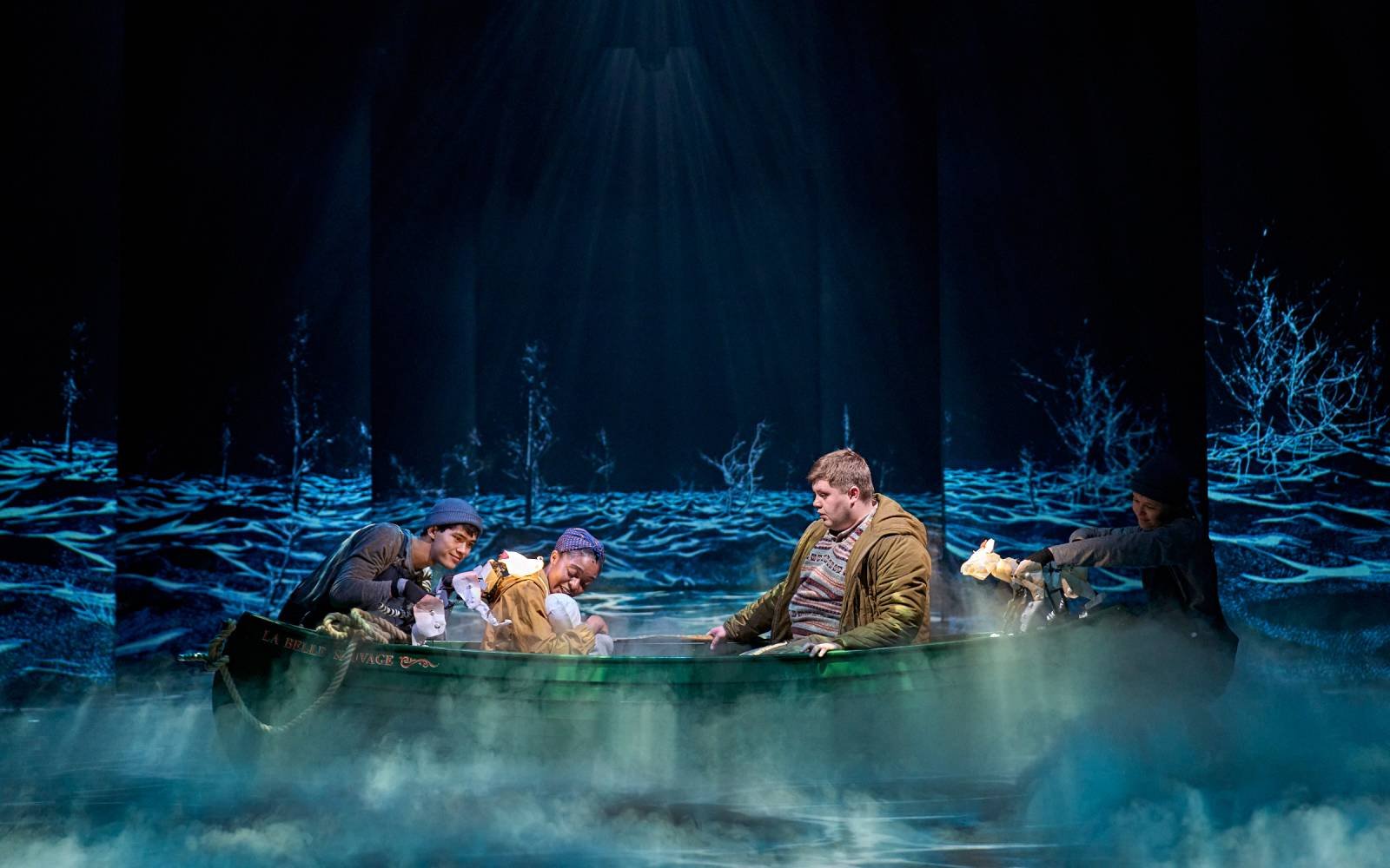 When animation enters the stage, therefore, it necessarily acts as a catalyst for that truth. In The Book of Dust, the breaking of the priory window signifies a shift in narrative mode, pivoting from ordinary life to the stylised drama of the flood. Filipe J. Carvalho, the production’s (somewhat fancifully named) ‘Illusions Designer’, dramatizes this transition through a dynamic sequence of projected animation, the shattered panes of the priory giving way to roiling floodwaters. Accompanied by an almighty sonic crash, the moment grounds Dust’s dramatic landscape – and yet Carvalho’s design also bespeaks a plasmatic unreality. The fragments of the windows fall light as leaves, seemingly without the pressure of gravity; detaching his animation from the impetus to signify real windows, Carvalho instead prompts the viewer towards an emotional iconographic reading. A curious doubling occurs, in which the viewer simultaneously experiences the intensity of the scene and metabolises its symbolic potency.