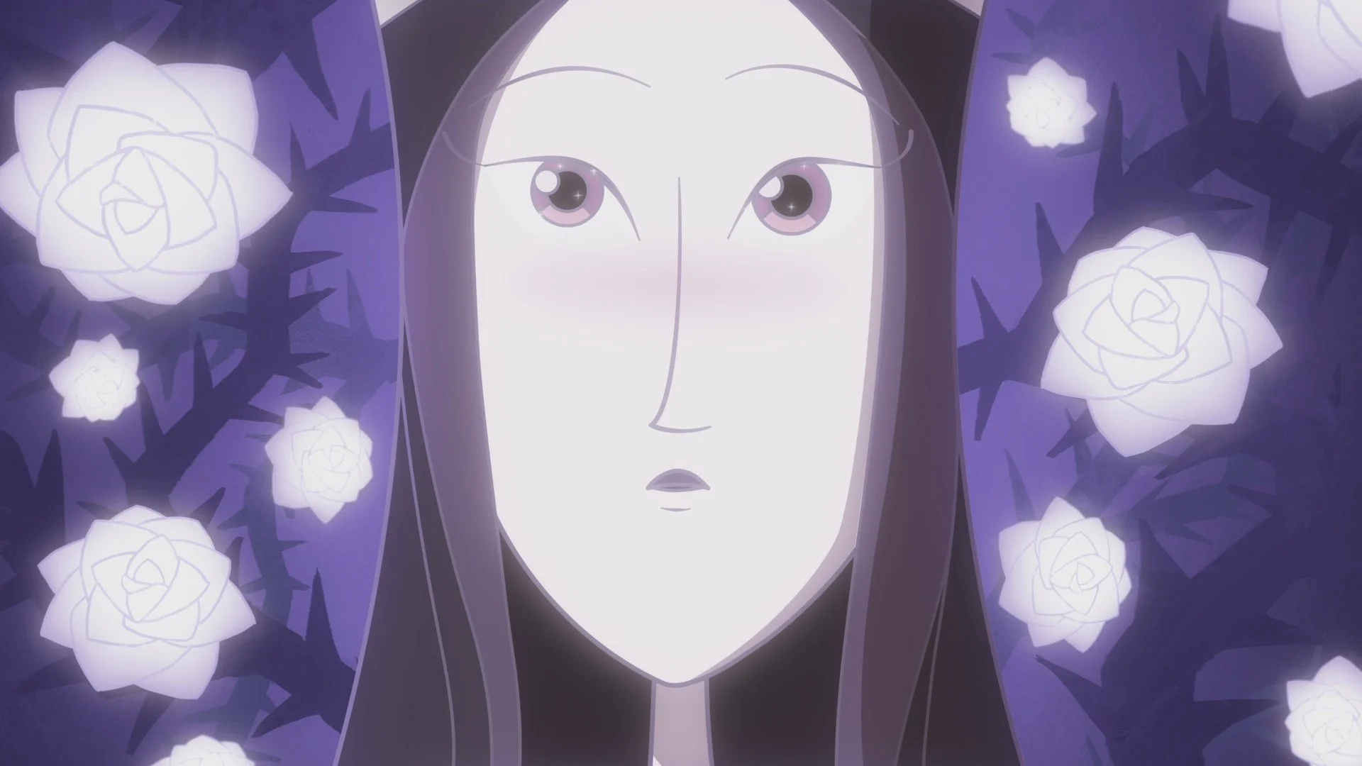 This duality is uniquely suited to animation. Animation allows metaphor itself to become visible because of the higher suspension of audience disbelief inherent to the medium. Abstract imagery can reveal a character’s inner state without explanation or reliance on facial expressions alone. For instance, when the princess hears the words “free forever more,” the thorny vines that symbolized her mistrust of yet another suitor erupt into delicate white flowers, a fleeting glimpse of the world she longs for (Figs. 3 and 4).
