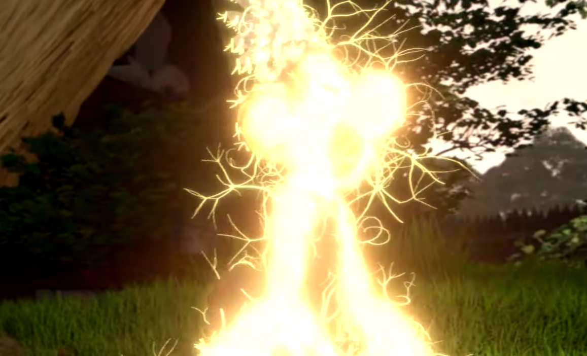 In the 2000s, meanwhile, the developers of the saga’s video games would seize on the magic potion as the most straightforward of temporary power-ups (available, naturally, only to Asterix), while the VFX artists of the live-action films would conjure the most unsettling acts of violence inflicted on the face of a French actor since Un Chien Andalou (Luis Buñuel, 1929). In 2014, Asterix would receive his first fully digital animated body on the big screen in The Mansions of the Gods. Here the drink has an electric effect – we are on computers, after all. We watch a charge spread through him, tracing his nervous system. Sparks scatter through the air, announcing mastery of particle effects (Fig. 4). Asterix, of course, knows nothing of any of this: for him, “electric” is just a name for Goths.