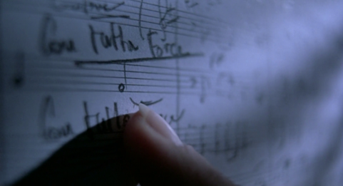Žižek explains that a fetish enables the subject to accept a traumatic reality while still emotionally disavowing it rationally. Julie’s final decision to complete her husband’s unfinished composition signals her re-entry into symbolic life and her readiness to begin mourning. I am particularly drawn to Žižek’s reading of Blue and Kieślowski’s anchoring of Julie’s grief in the form of the unfinished musical composition, which occupies a paradoxical position between material and immaterial presence. Kieślowski actively tried to render music tactile and tangible in the film; the tracking shots of Julie’s figure glided across the music sheets, with music conjured non-diegetically, as a form of free indirect discourse (Fig. 1).