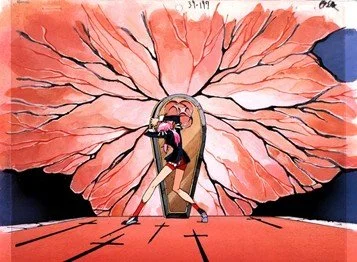 In the series, the “Black Rose Saga” is designed as the one-way corridor leading toward the climax of the “Apocalypse Saga.” Yet this movement is not truly linear; rather, when viewed, the formal repetition of the cels and the composition with each passing duel scenes felt almost endless in its cyclicality (Fig. 3). However, the sliding motion of the celluloid layers, first descending and then rising again, powers the elevator that sinks into a space shaped by denial and grief, gaining momentum as fantasies begin to crack. I hope that, over the course of these two blogs, I have shown that the “celluloid body,” like the photographic or musical object, mediates and displaces non-normative desires through the multidirectional flow of libidinal energy that departs or leaks from the stabilising logic of the Symbolic Order.